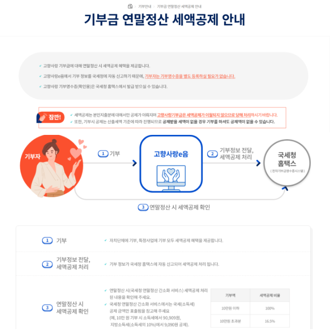 세액공제: 기부금 10만 원까지는 전액 세액공제가 되며, 10만 원 초과분에 대해서는 16.5%의 세액공제가 적용됩니다. 특히, 특별재난지역으로 지정된 산불 피해 지역에 기부할 경우, 10만 원 초과분에 대해 기존보다 2배 높은 33%의 세액공제가 적용됩니다.