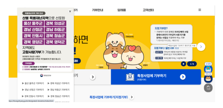 3. 기부 지역 선택: 홈페이지에서 '산불 피해 긴급 모금' 또는 특정 피해 지역(예: 산청군, 의성군 등)을 선택합니다.