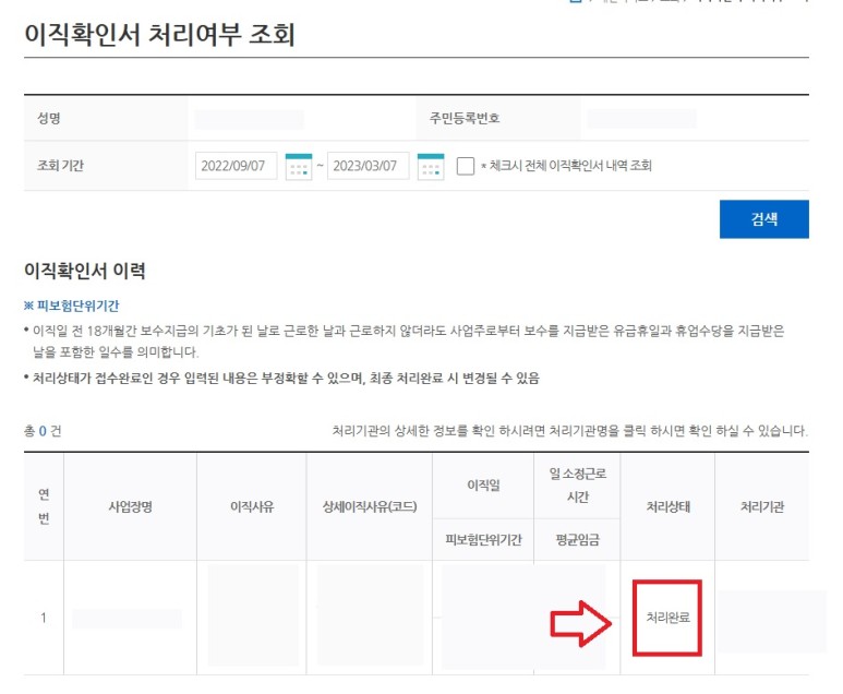 그 다음 고용 보헙 사이트에 접속해 간단한 인증후 이직확인서 처리란에 완료가 되었는지 확인합니다.