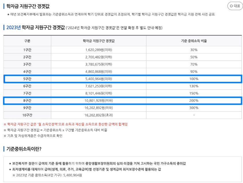 2024년도의 소득분위 기준은 2023년 기준 중위소득인 5,400,964원에 따라 일정 비율이 차등 적용될 예정입니다. 이는 2024년 학자금 지원 구간 경곗값이 연말에 확정된 후에 별도로 안내될 예정이므로, 이점 유의하시기 바랍니다.