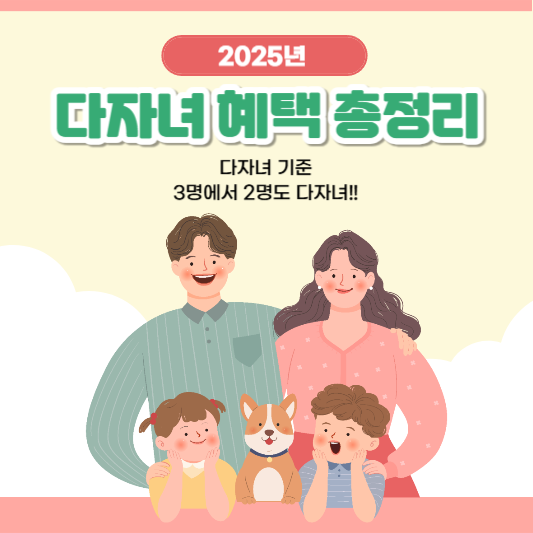 2025년부터 다자녀 가구 기준이 기존 3명에서 2명으로 완화되면서, 두 자녀를 둔 가정도 다양한 정부 지원 혜택을 받을 수 있게 되었습니다. 주거, 교육, 세제, 교통 등 여러 분야에서 실질적인 혜택이 확대되었으며, 특히 저출산 문제 해결을 위한 정부의 적극적인 대응책으로 지원 범위가 넓어졌습니다. 이에 따라 더 많은 가정이 혜택을 받을 수 있게 되었으며, 신청 방법과 대상 조건을 꼼꼼히 확인하여 혜택을 누리시기 바랍니다.
